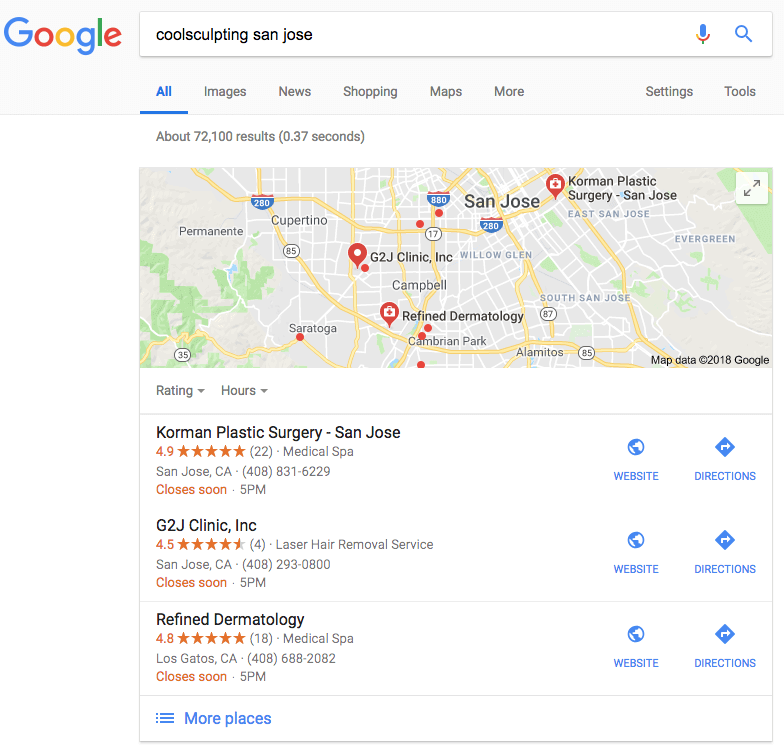 Next comes reviews. Have a procedure in place to get as many reviews as you can from your patients and you will win at the local SEO game. Local results appear for people who search for businesses and places near their location. The Local SEO map pack portion appears in position 0, at the top of the page. They’re shown in a number of places across Google Maps and Google Search. For example, Google will try to show you the nearby practices that you might like to visit if you search for “CoolSculpting San Jose”. In the image below, Google uses local results to suggest some options.